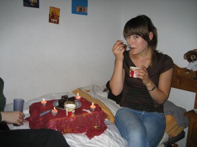 Dann wurden mir die Augen verbunden plötzlich, ich wurd in Sina Zimmer geführt (die natürlich zu haus war) und hab voll die tolle Überraschung mit Kerzen und Häagen Dazs Eis, Kuchen, Sekt und Geburtstagsliedern bekommen!:) Sooo toll!!